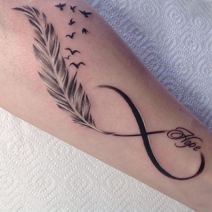 Ce tatouage symbolise principalement la liberté infinie, l’éternité et une connexion spirituelle. La plume évoque légèreté et voyage intérieur, tandis que le symbole infini incarne l’éternité et les cycles sans fin.
